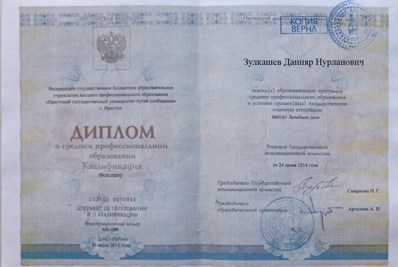 Меня зовут Зулкашев Данияр Нурланович, я — фельдшер выездной наркологической бригады в наркологической клинике "Плюс" в Отрадном. Я стремлюсь помогать людям, оказывая квалифицированную медицинскую помощь в самых разных ситуациях, и верю, что каждый пациент заслуживает внимания и поддержки на пути к выздоровлению.